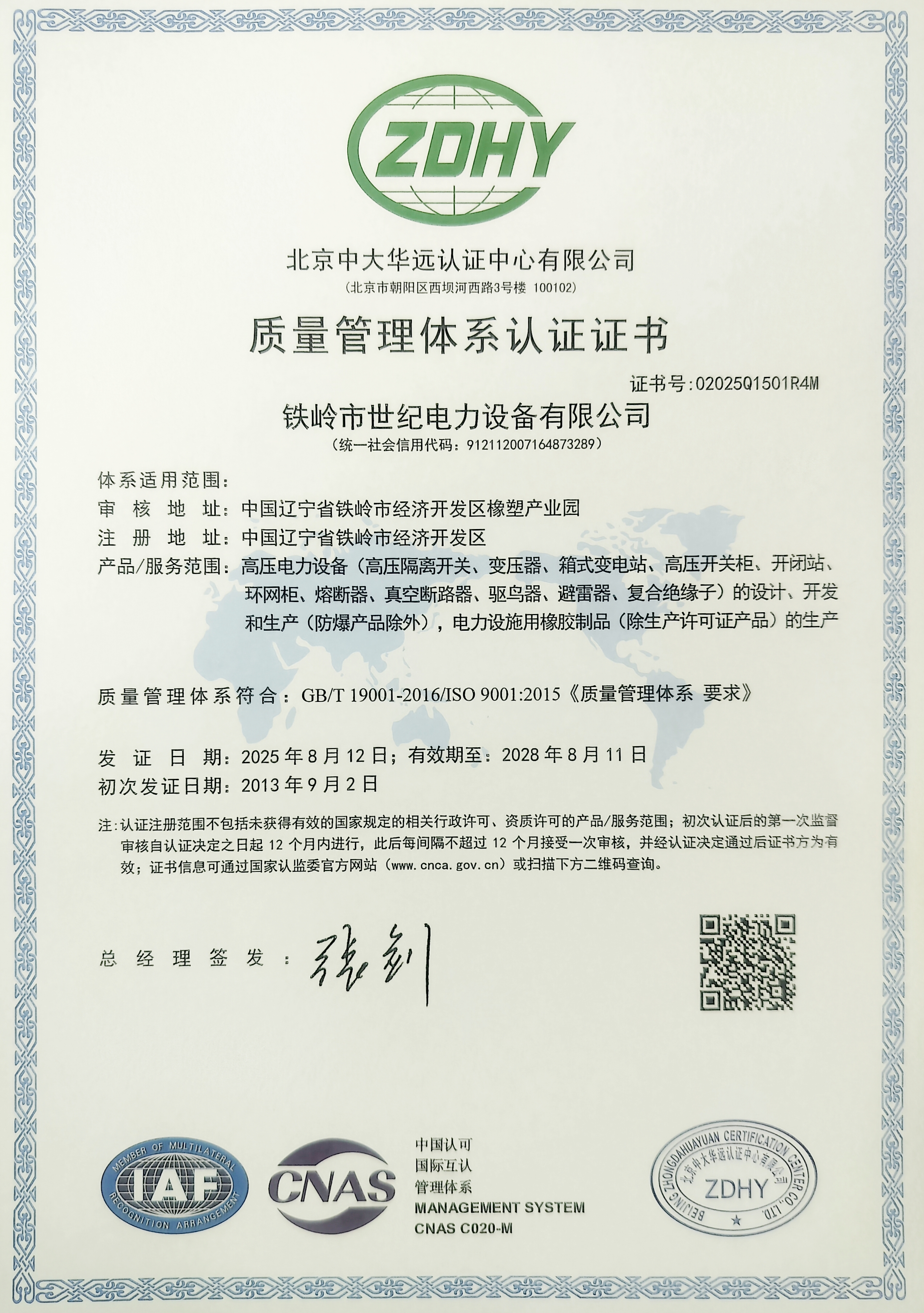 鐵嶺市世紀電力設備有限公司是集科研開發(fā)、生產制造、用戶服務于一體的國家高新技術企業,始建于1999年,位于鐵嶺經濟開發(fā)區,占地面積5萬余平方米,建筑面積2萬余平方米。主要從事國家電網配套戶外高低壓隔離開關、電力電纜、變壓器成套裝置、高低壓開關柜、箱式變電站、絕緣子等產品的研發(fā)、生產和銷售。公司現有國家發(fā)明專利6項、實用新型專利9項,公司通過了ISO9001國際質量管理體系認證、ISO14001環(huán)境管理體系認證和ISO 45001職業健康安全體系認證。